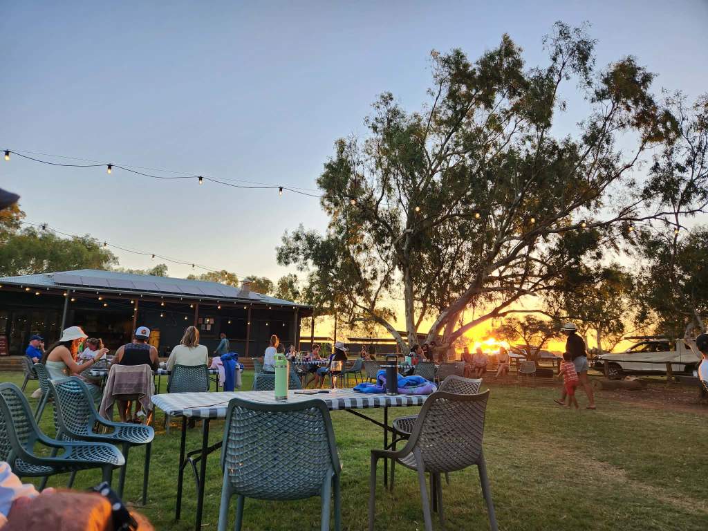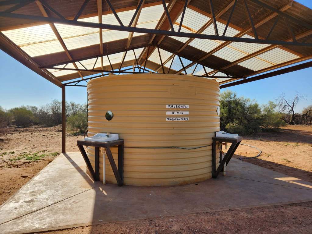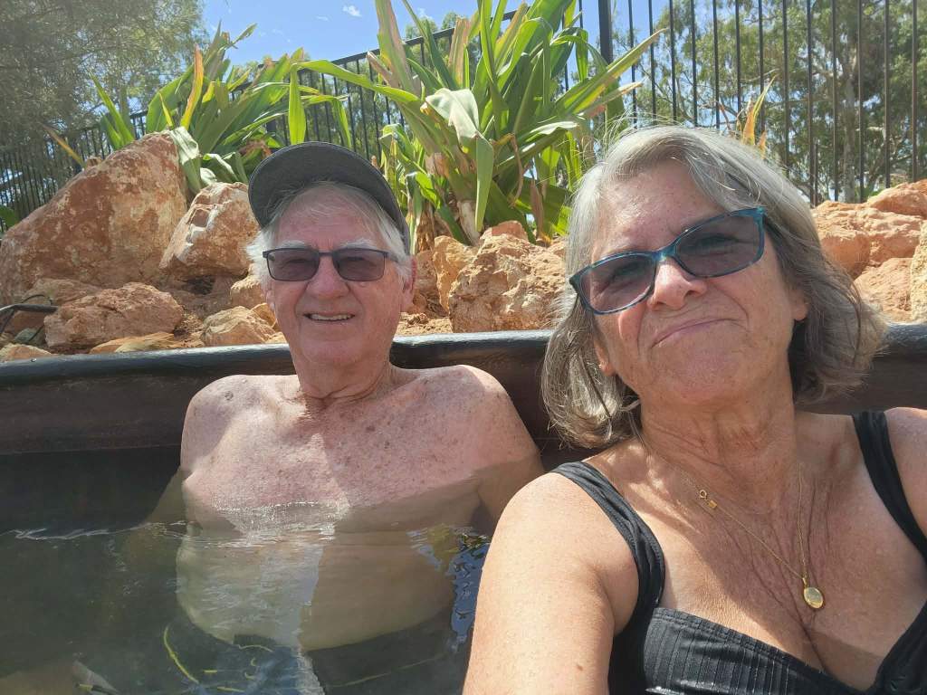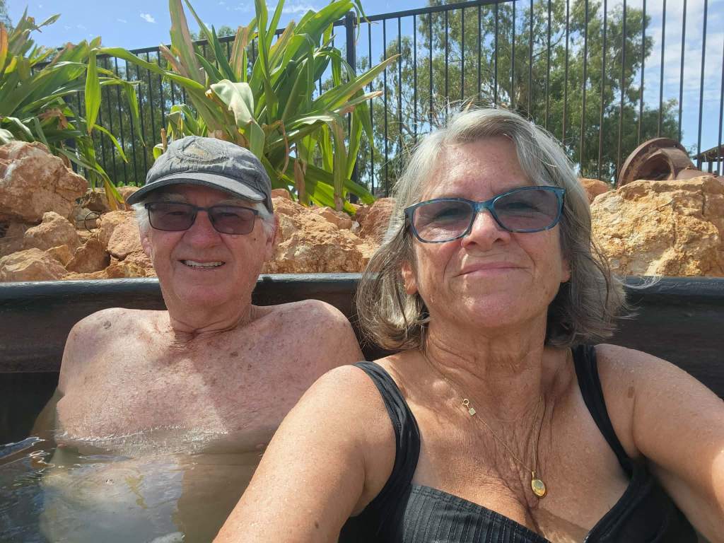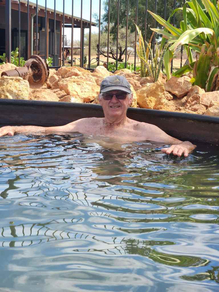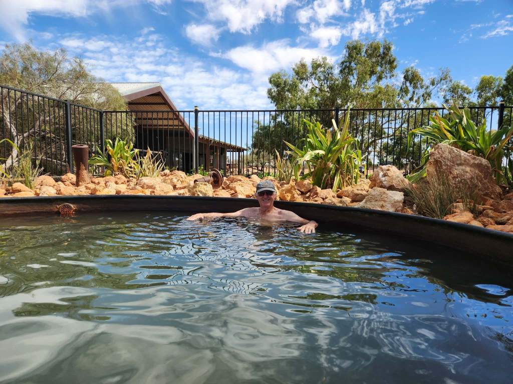 Although we are self-contained, it was good to see that the campsite had flushing toilets, solar showers and camp kitchens. What was more of a surprise was that it had a lovely outdoor cafΓ©/bar with live music in the evenings. An extra bonus were the four Artesian Baths available 24 hours a day for use by campers. I persuaded John that the magnesium and other minerals might just help his muscle cramps and aches and pains so we enjoyed half an hour of relaxation in one of the baths. It was the temperature of a very warm bath. Lovely!